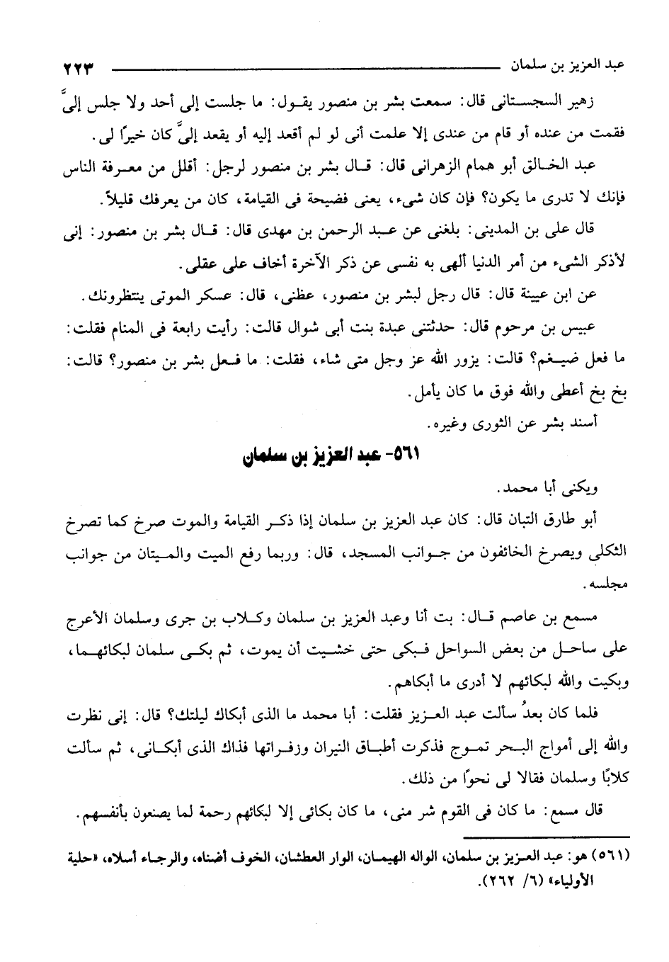 561 - هو: عبد العزيز بن سلمان، الواله الهيمان، الخوف أضناه، والرجاء أسلاه، حلية الأولياء 6/262.