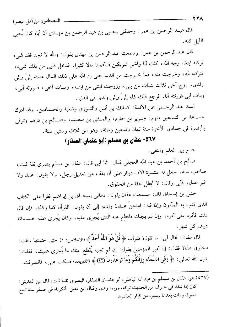 قال عفان: فقال لي: ما تقول؟ فقرأت {قُلْ هُوَ اللَّهُ أَحَدٌ} الإخلاص: 1 حتى ختمتها وقلت: مخلوق هذا؟ فقال: إن أمير المؤمنين يقول إن لم تجبه يقطع عنك ما يجرى عليك فقلت يقول الله تعالى: {وَفِي السَّمَاءِ رِزْقُكُمْ وَمَا تُوعَدُونَ} الذاريات فسكت عني، فانصرفت.