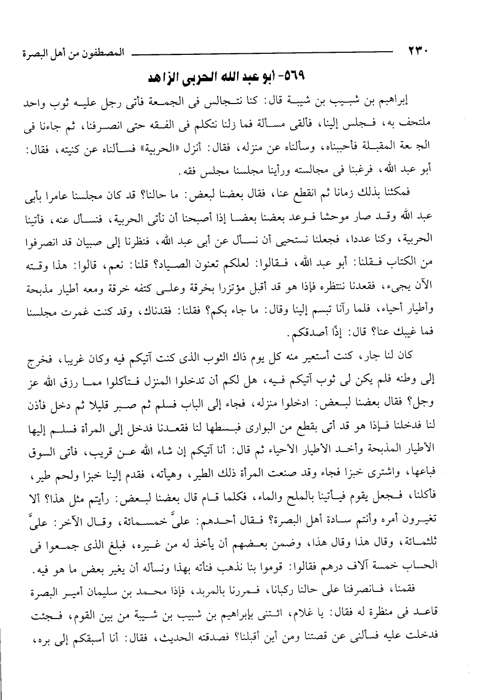 فمكثنا بذلك زماناً ثم انقطع عنا فقال بعضنا لبعض: ما حالنا؟ قد كان مجلسنا عامراً بأبي عبد الله وقد صار موحشاً فوعد بعضنا بعضاً إذا أصبحنا أن نأتي الحربية فنسأل عنه. فأتينا الحربية وكنا عدداً فجعلنا نستحي أن نسأل عن أبي عبد الله فنظرنا إلى صبيان قد انصرفوا من الكتاب فقلنا: أبو عبد الله. فقالوا: لعلكم تعنون الصياد؟ قلنا نعم. قالوا هذا وقته الآن يجيء. فقعدنا ننتظره فإذا هو قد أقبل مؤتزراً بخرقة وعلى كتفه خرقة ومعه أطيار مذبحة وأطيار أحياء. فلما رآنا تبسم إلينا وقال: ما جاء بكم؟ فقلنا: فقدناك وقد كنت غمرت مجلسنا فما غيبك عنا؟ قال: إذاً أصدقكم.