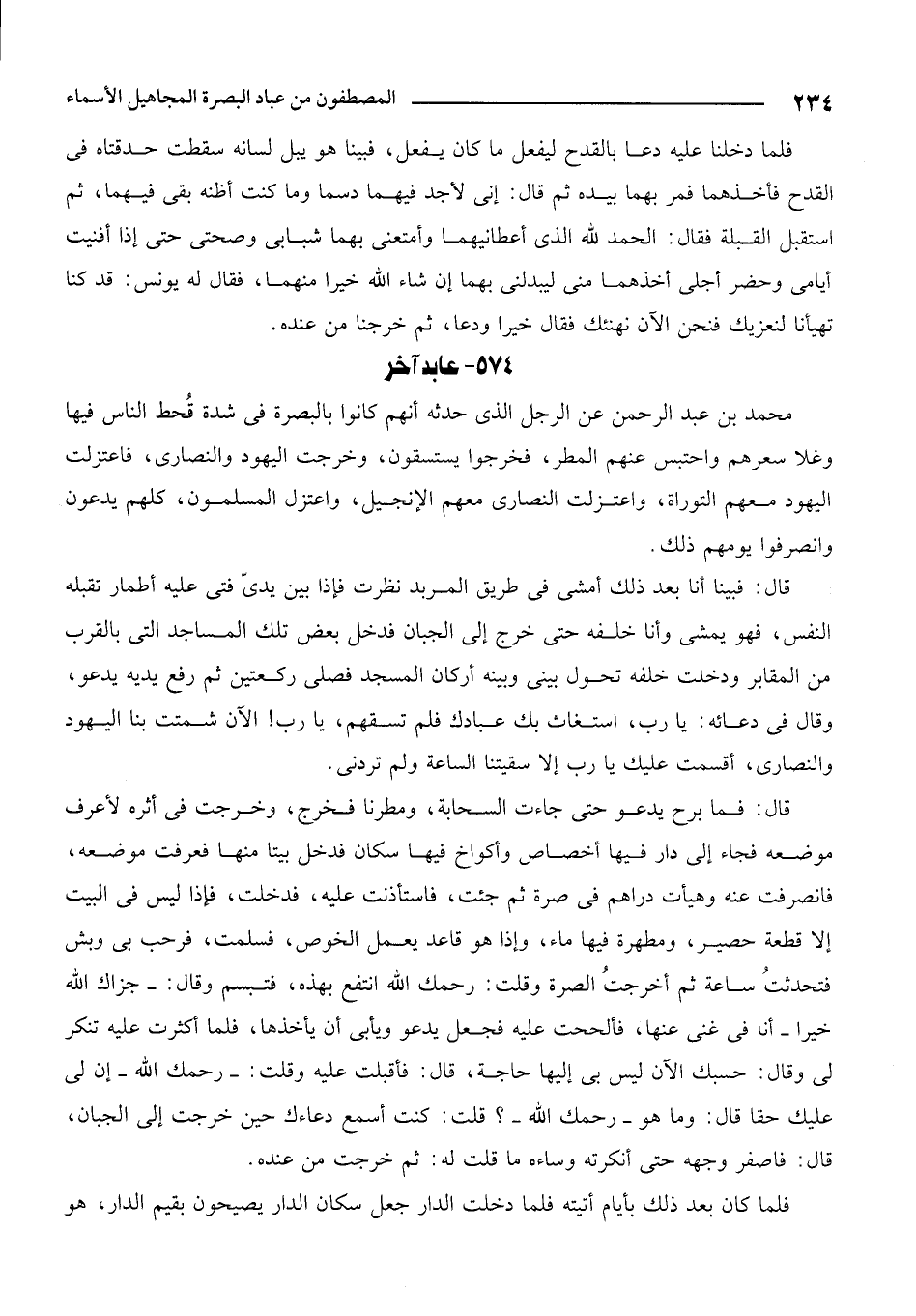 قال: فبينا أنا بعد ذلك أمشي في طريق المريد نظرت فإذا بين يدي فتى عليه أطمار، تقيلة النفس فهو يمشي وأنا خلفه حتى خرج إلى الجبان فدخل بعض تلك المساجد التي بالقرب من المقابر ودخلت خلفه تحول بيني وبينه أركان المسجد فصلى ركعتين ثم رفع يديه يدعو، وقال في دعائه: يا رب استغاث بك عبادك فلم تسقهم، يا رب الآن شمتت بنا اليهود والنصارى، أقسمت عليه يا رب إلا سقيتنا الساعة ولم تردني.