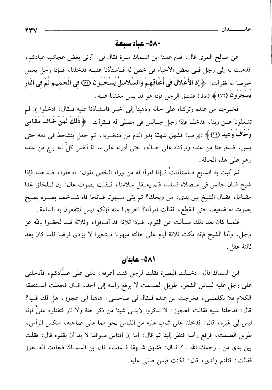 عن صالح المري قال: قدم علينا ابن السماك مرة فقال لي: أرني بعض عجائب عبادكم فذهبت به إلى رجل في بعض الأحياء في خص له فاستأذنا عليه فدخلنا، فإذا رجل يعمل خوصاً له فقرأت {إِذِ الْأَغْلالُ فِي أَعْنَاقِهِمْ وَالسَّلاسِلُ يُسْحَبُونَ * فِي الْحَمِيمِ ثُمَّ فِي النَّارِ يُسْجَرُونَ} غافر فشهق الرجل فإذا هو قد يبس مغشياً عليه.