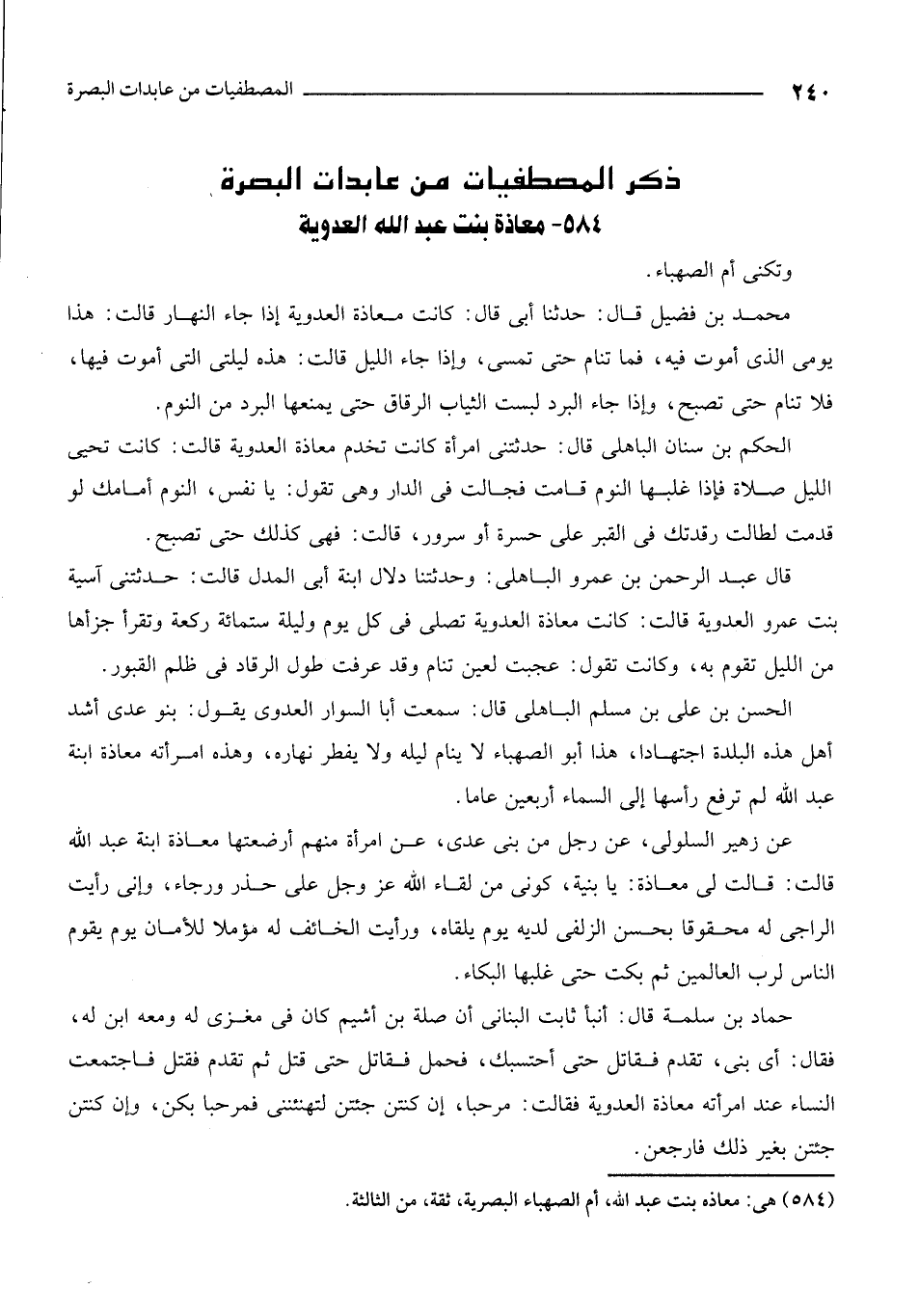 584 - هي: معاذة بنت عبد الله، أم الصهباء البصرية، ثقة، من الثالثة.