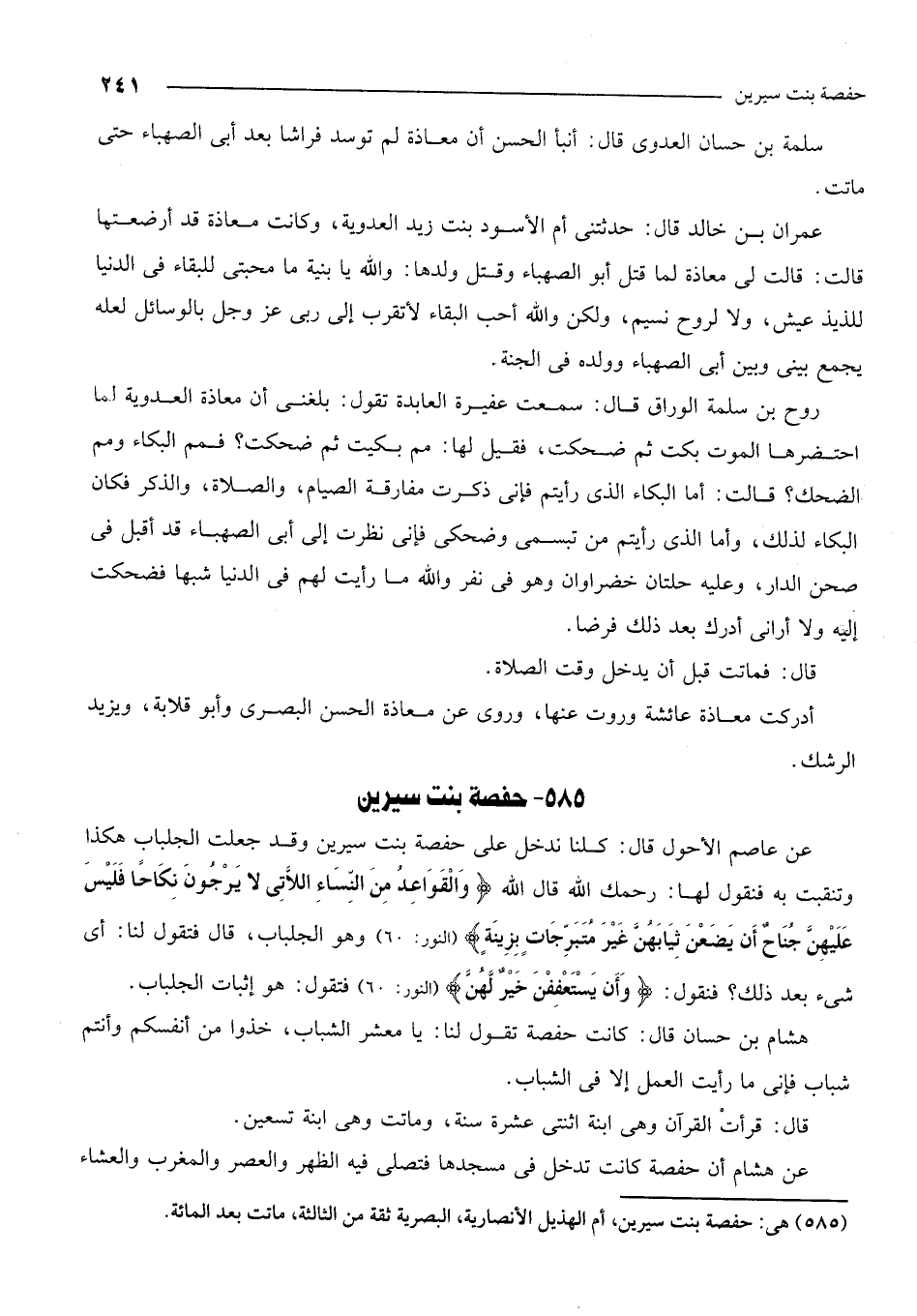 585 - هي: حفصة بنت سيرين، أم الهذيل الأنصارية، البصرية ثقة من الثالثة، ماتت بعد المائة.