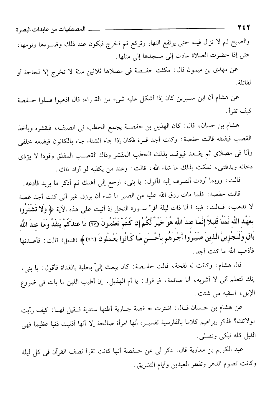 عن مهدي بن ميمون قال: مكثت حفصة في مصلاها ثلاثين سنة لا تخرج إلا لحاجة أو لقائلة.