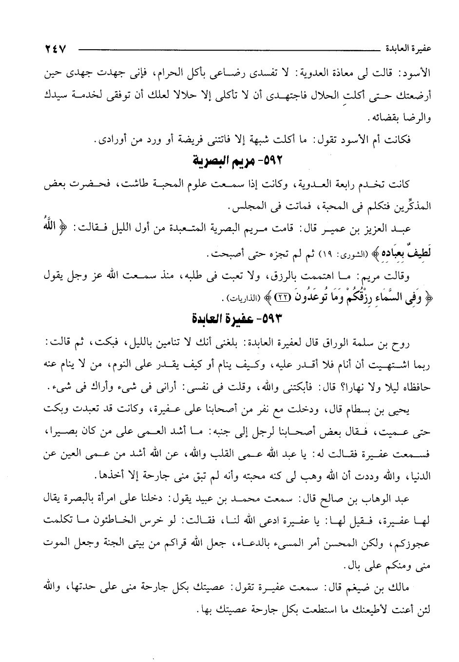 عبد العزيز بن عمير قال: قامت مريم البصرية المتعبدة من أول الليل فقالت: {اللَّهُ لَطِيفٌ بِعِبَادِهِ} الشورى: 19. ثم لم تجزه حتى أصبحت.
