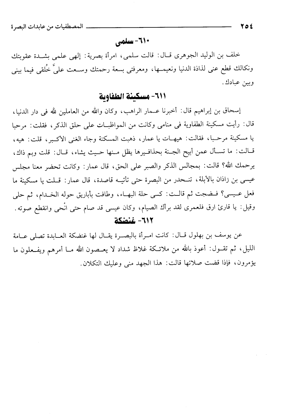 عن يوسف بن بهلول قال: كانت امرأة بالبصرة يقال لها غنضكة العابدة تصلي عامة الليل، ثم تقول: أعوذ بالله من ملائكة غلاظ شداد لا يعصون الله ما أمرهم ويفعلون ما يؤمرون، فإذا قضت صلاتها قالت: هذا الجهد مني وعليك التكلان.