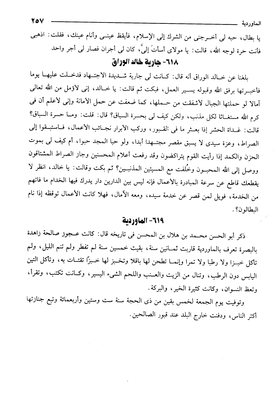 ذكر أبو الحسن محمد بن هلال بن المحسن في تاريخه قال: كانت عجوز صالحة زاهدة بالبصرة تعرف بالماوردية قاربت ثمانين سنة، بقيت خمسين سنة لم تفطر ولم تنم بالليل، ولم تأكل خبزاً ولا رطباً ولا تمراً وإنما تطحن لها باقلاً وتخبز لها خبزاً تقتات به، وتأكل التين اليابس دون الرطب، وتنال من الزيت والعنب واللحم الشيء اليسير، وكانت تكتب وتقرأ وتعظ النسوان وكانت كثيرة الخير والبركة.