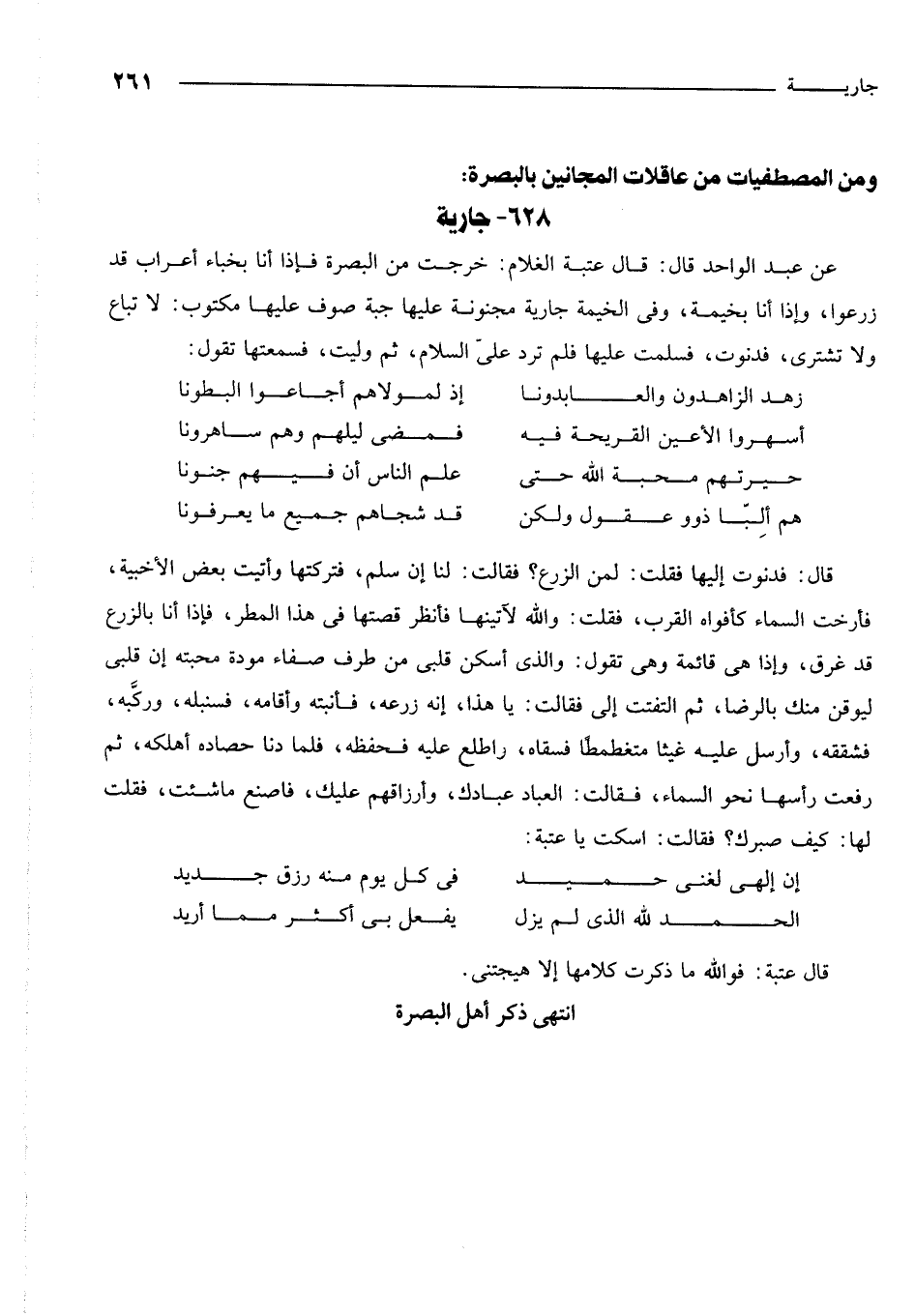 قال: فدنوت إليها فقلت: لمن الزرع؟ فقالت: لنا إن سلم، فتركتها وأتيت بعض الأخبية فأرخت السماء كأفواه القرب. فقلت: والله لآتينها فأنظر قصتها في هذا المطر، فإذا أنا بالزرع قد غرق وإذا هي قائمة وهي تقول: والذي أسكن قلبي من طرف صفاء مودة محبته إن قلبي ليوقن منك بالرضا. ثم التفتت إلي فقالت: يا هذا إنه زرعه فأنبته وأقامه فسنبله وركبه فشققه وأرسل عليه غيثاً متغطمطاً فسقاه، واطلع عليه فحفظه فلما دنا حصاده أهلكه. ثم رفعت رأسها نحو السماء فقالت: العباد عبادك، وأرزاقهم عليك، فاصنع ما شئت فقلت لها: كيف صبرك؟ فقالت: اسكت يا عتبة: