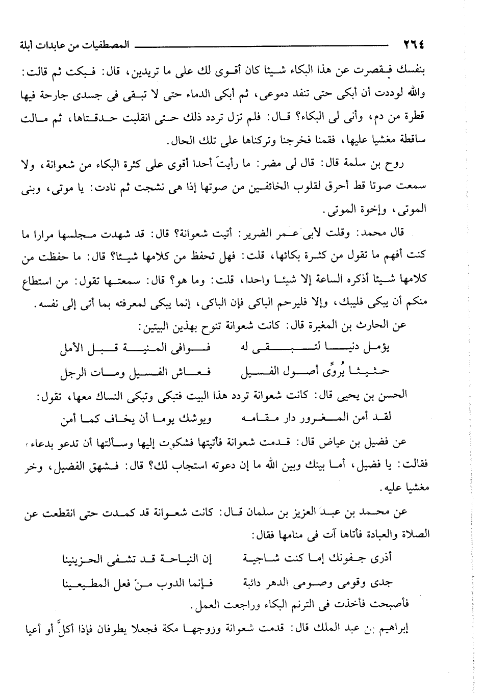 قال محمد: وقلت لأبي عمر الضرير: أتيت شعوانة؟ قال: قد شهدت مجلسها مراراً ما كنت أفهم ما تقول من كثرة بكائها. قلت: فهل تحفظ من كلامها شيئاً؟ قال: ما حفظت من كلامها شيئاً أذكره الساعة إلا شيئاً واحداً، قلت: وما هو؟ قال: سمعتها تقول: من استطاع منكم أن يبكي فليبك وإلا فليرحم الباكي فإن الباكي إنما يبكي لمعرفته بما أتى إلى نفسه.