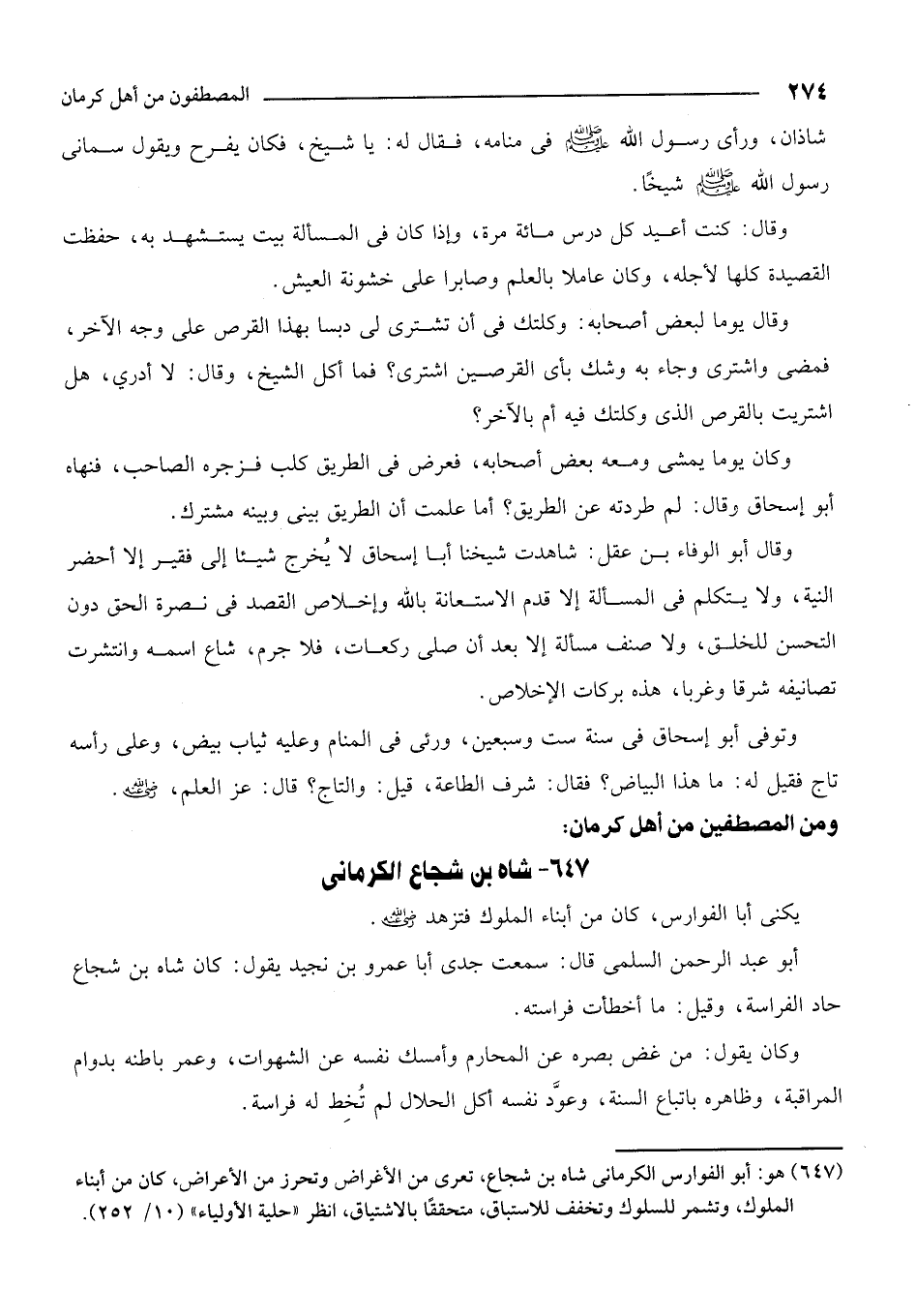 647 - هو: أبو الفوارس الكرماني شاه بن شجاع، تعرى من الأعراض وتحرز من الأعراض، كان من أبناء الملك، وتشمر للسلوك وتخفف للاستباق، متحققا بالاشتياق، انظر حلية الأولياء 10/252.
