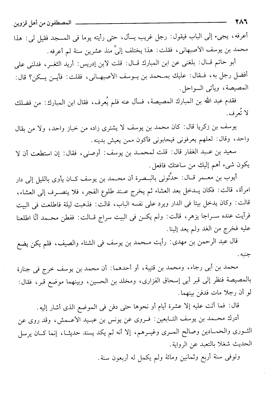 أعرفه، يجيء إلى الباب فيقول: رجل غريب يسأل حتى رأيته يوماً في المسجد فقيل لي: هذا محمد بن يوسف الأصبهاني، فقلت: هذا يختلف إلي منذ عشرين سنة لم أعرفه.