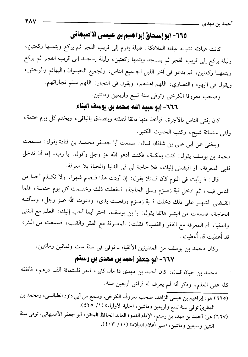667 - هو: أحمد بن مهد، بن رستم، الإمام القدوة العابد الحافظ المتقن، أبو جعفر الأصبهاني، توفي سنة اثنتين وسبعين ومائتين، سير أعلام النبلاء 10/403.