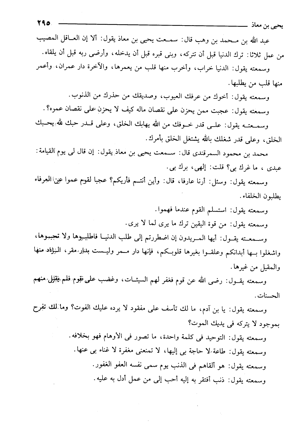 عبد الله بن محمد بن وهب قال: سمعت يحيى بن معاذ يقول: ألا إن العاقل المصيب من عمل ثلاثاً: ترك الدنيا قبل أن تتركه، وبنى قبره قبل أن يدخله، وأرضى ربه قبل أن يلقاه.
