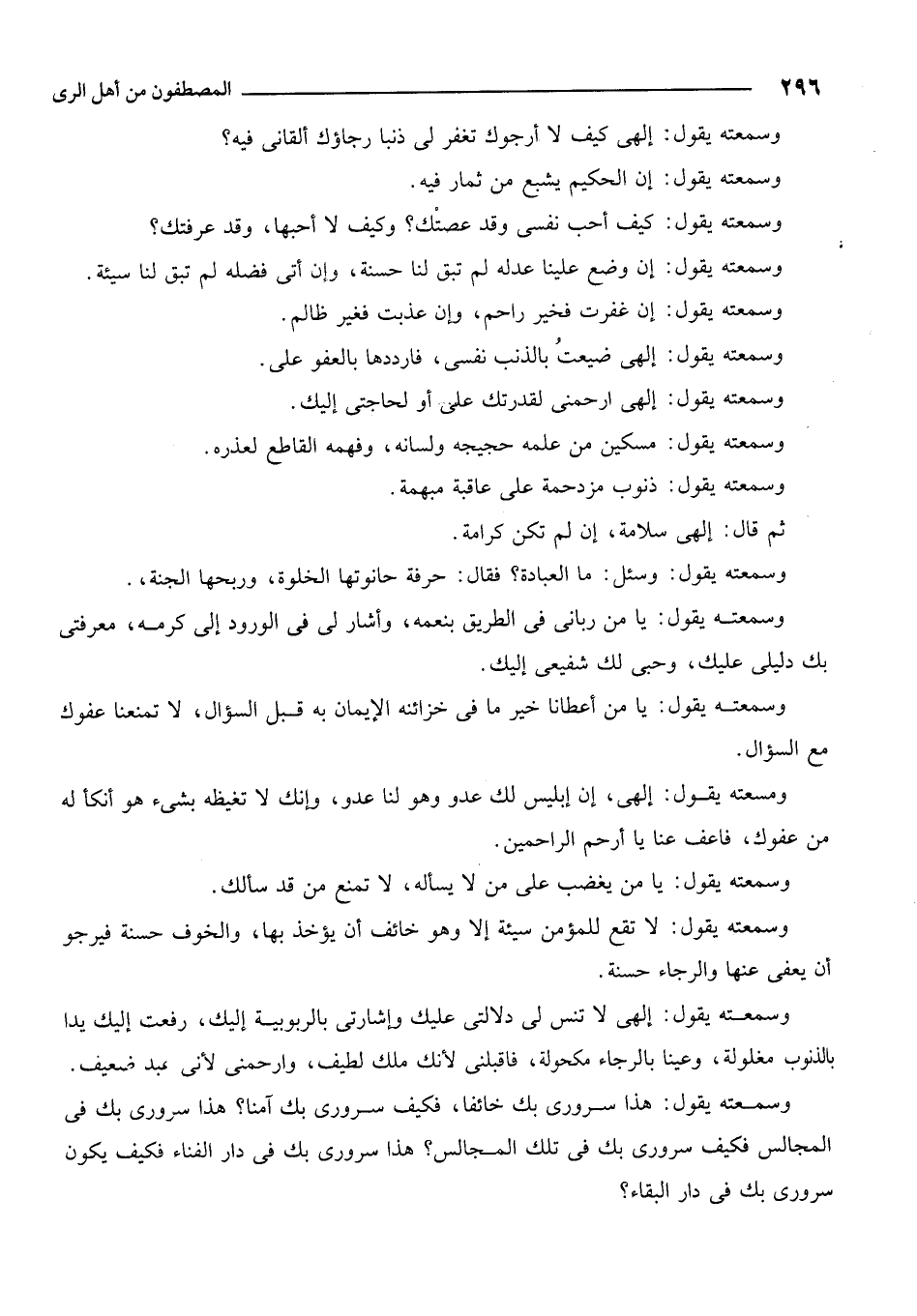 وسمعته يقولك إلهي لا تنس لي دلالتي عليك وإشارتي بالربوبية إليك، رفعت إليك يداً بالذنوب مغلولة، وعيناً بالرجاء مكحولة، فاقبلني لأنك ملك لطيف، وارحمني لأني عبد ضعيف.