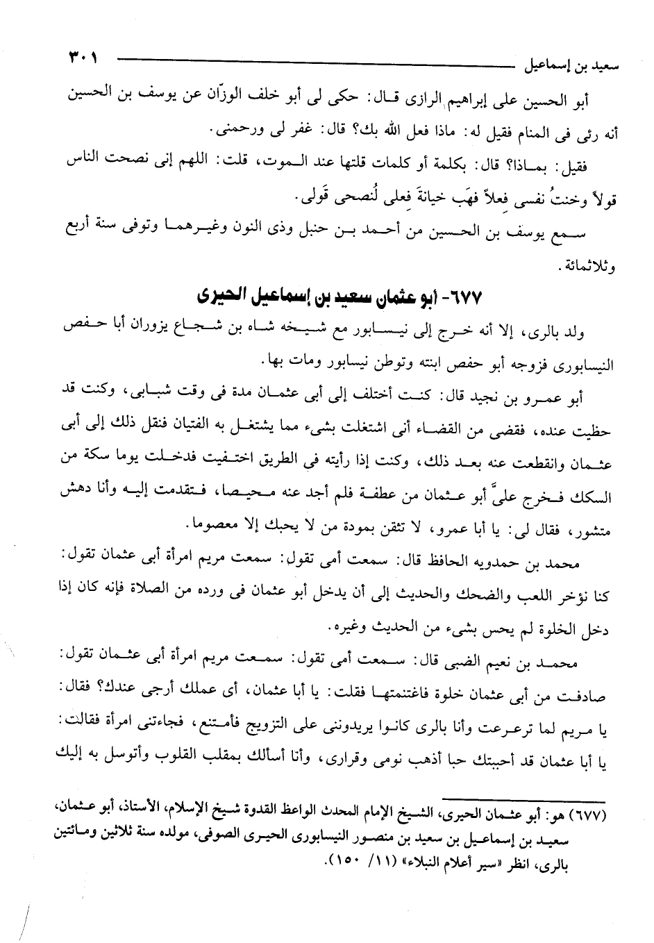 677 - هو: أبو عثمان الحيري، الشيخ الإمام المحدث الواعظ القدوة شيخ الإسلام، الأستاذ، أبو عثمان، سعيد بن إسماعيل بن سعيد بن منصور النيسابوري الحيري الصوفي، مولده سنة ثلاثين ومائتين بالري، انظر سير أعلام النبلاء 11/150.