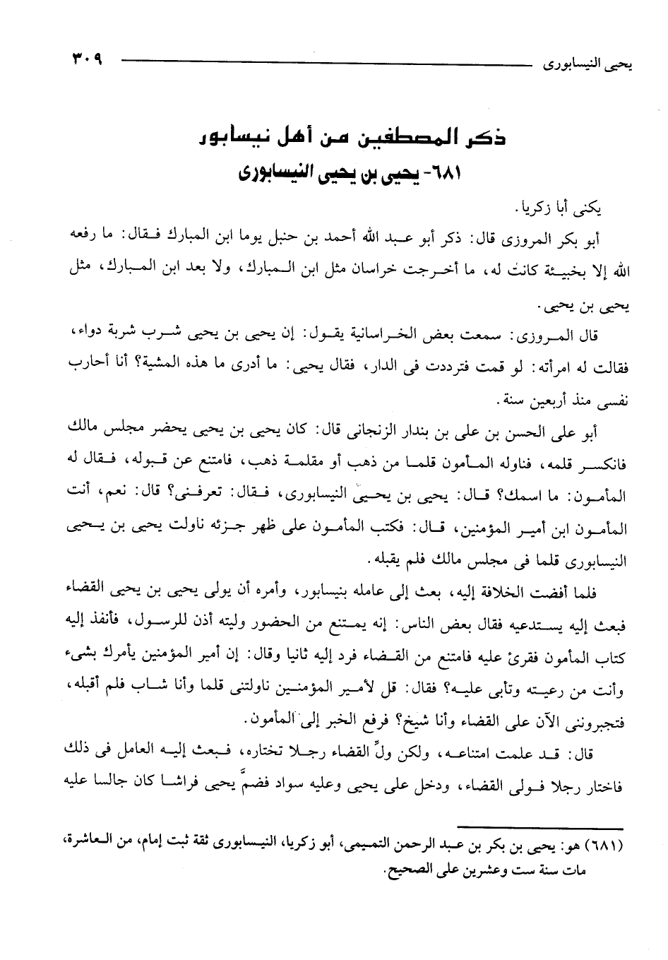 قال: قد علمت امتناعه ولكن ول القضاء رجلاً تختاره. فبعث إليه العامل في ذلك فاختار رجلاً فولي القضاء، ودخل على يحيى وعليه سواد فضم يحيى فراشاً كان جالساً عليه