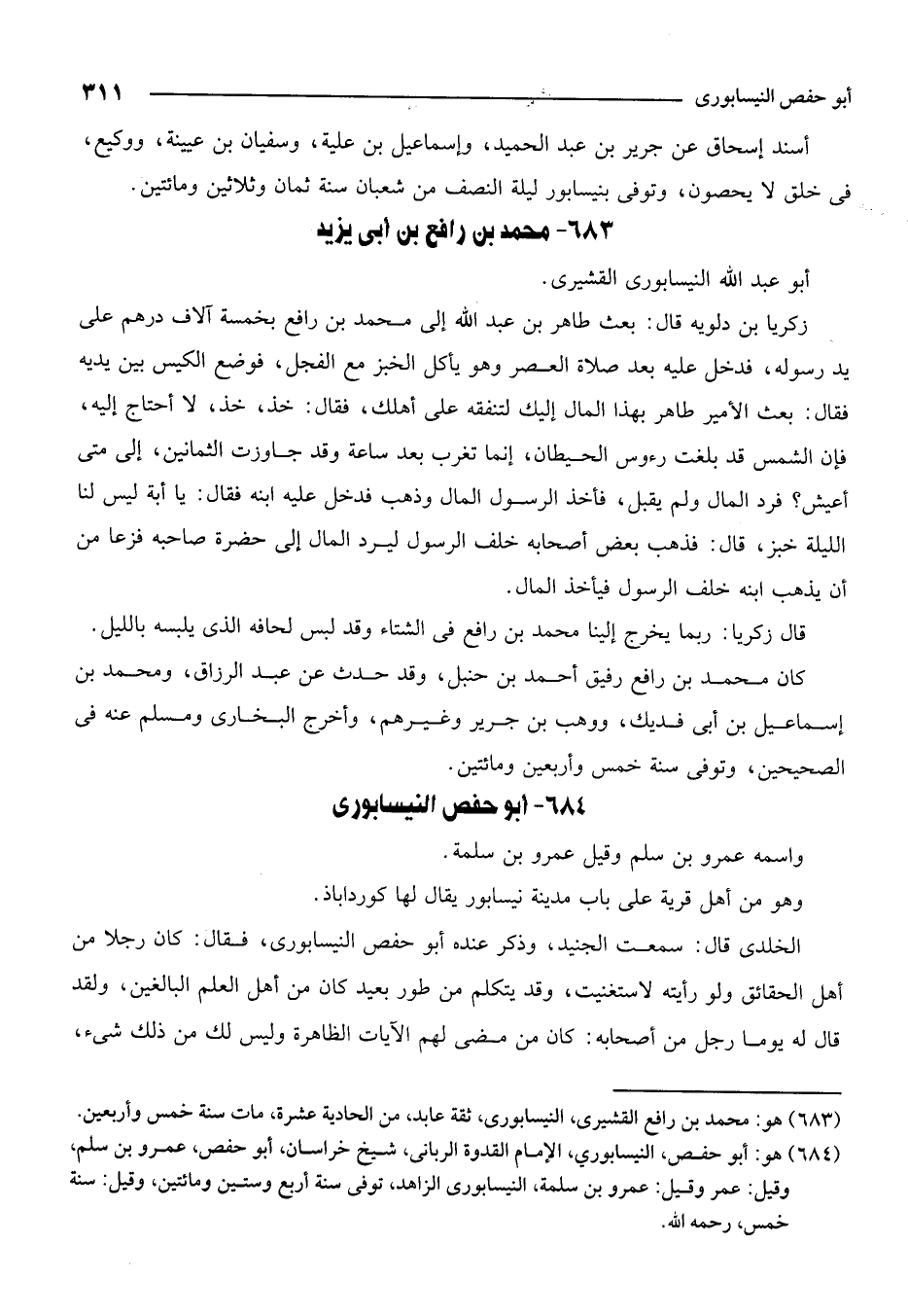 685 - هو: أبو حفص، النيسابوري، الإمام القدوة الرباني، شيخ خراسان، أبو حفص، عمرو بن سلم، وقيل: عمر وقيل: عمرو بن سلمة، النيسابوري الزاهد، توفي سنة أربع وستين ومائتين، وقيل: سنة خمس، رحمه الله.