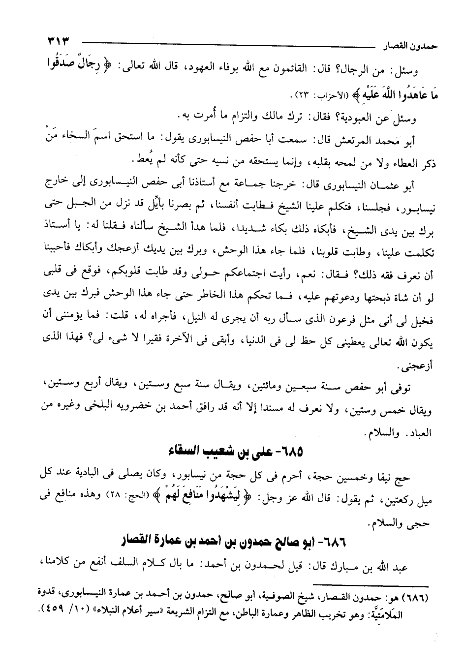 686 - هو: حمدون القصار، شيخ الصوفية، أبو صالح، حمدون بن أحمد بن عمارة النيسابوري، قدوة الملامتية: وهو تخريب الظاهر وعمارة الباطن، مع التزام الشريعة سير أعلام النبلاء 10/459.