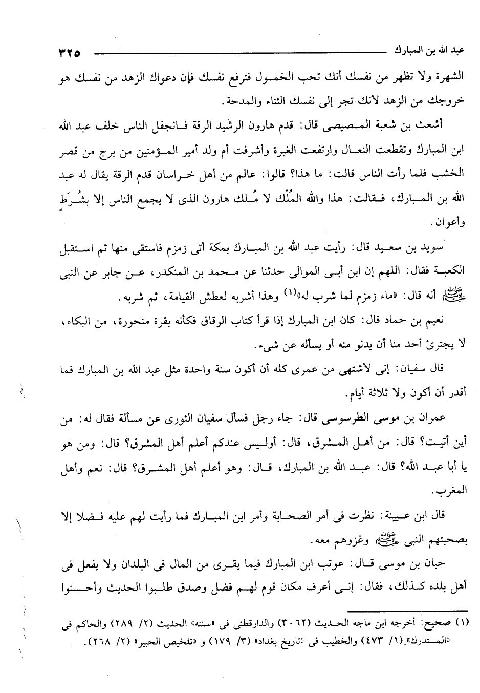 سويد بن سعيد قال: رأيت عبد الله بن المبارك بمكة أتى زمزم فاستقى منها ثم استقبل الكعبة فقال: اللهم إن ابن أبي الموالي حدثنا عن محمد بن المنكدر عن جابر عن النبي صلى الله عليه وسلم أنه قال: "ماء زمزم لما شرب له" 1 وهذا أشربه لعطش القيامة، ثم شربه.