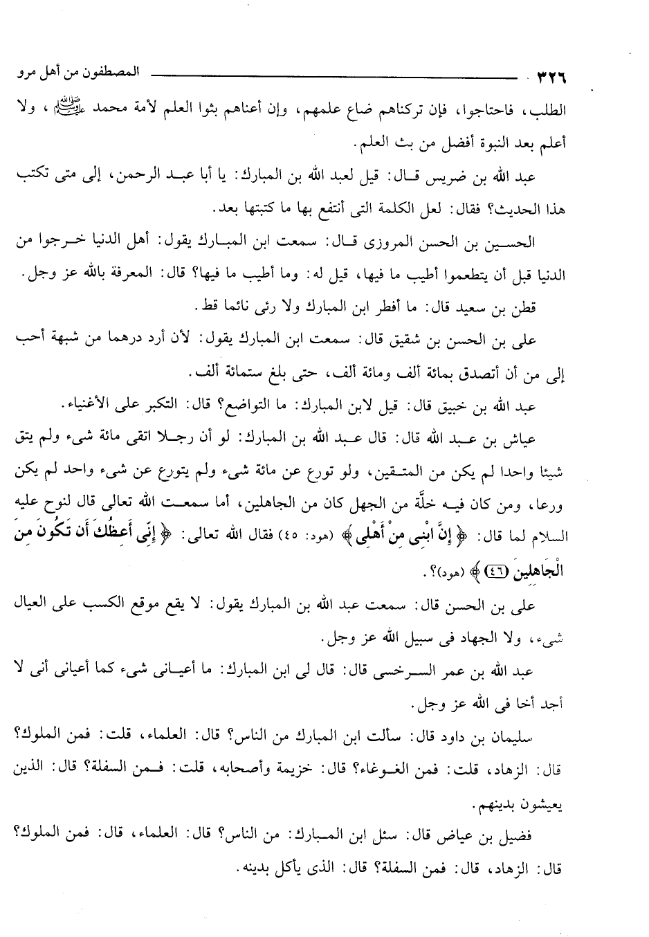 عياش بن عبد الله قال: قال عبد الله بن المبارك: لو أن رجلاً أبقى مائة شيء ولم يبق شيئاً واحداً لم يكن من المتقين. ولو تورع عن مائة شيء ولم يتورع عن شيء واحد لم يكن ورعاً ومن كان فيه خلة من الجهل كان من الجاهلين. أما سمعت الله تعالى قال لنوح عليه السلام لما قال: {إِنَّ ابْنِي مِنْ أَهْلِي} هود: 45 فقال الله تعالى: {إِنِّي أَعِظُكَ أَنْ تَكُونَ مِنَ الْجَاهِلِينَ} هود؟.