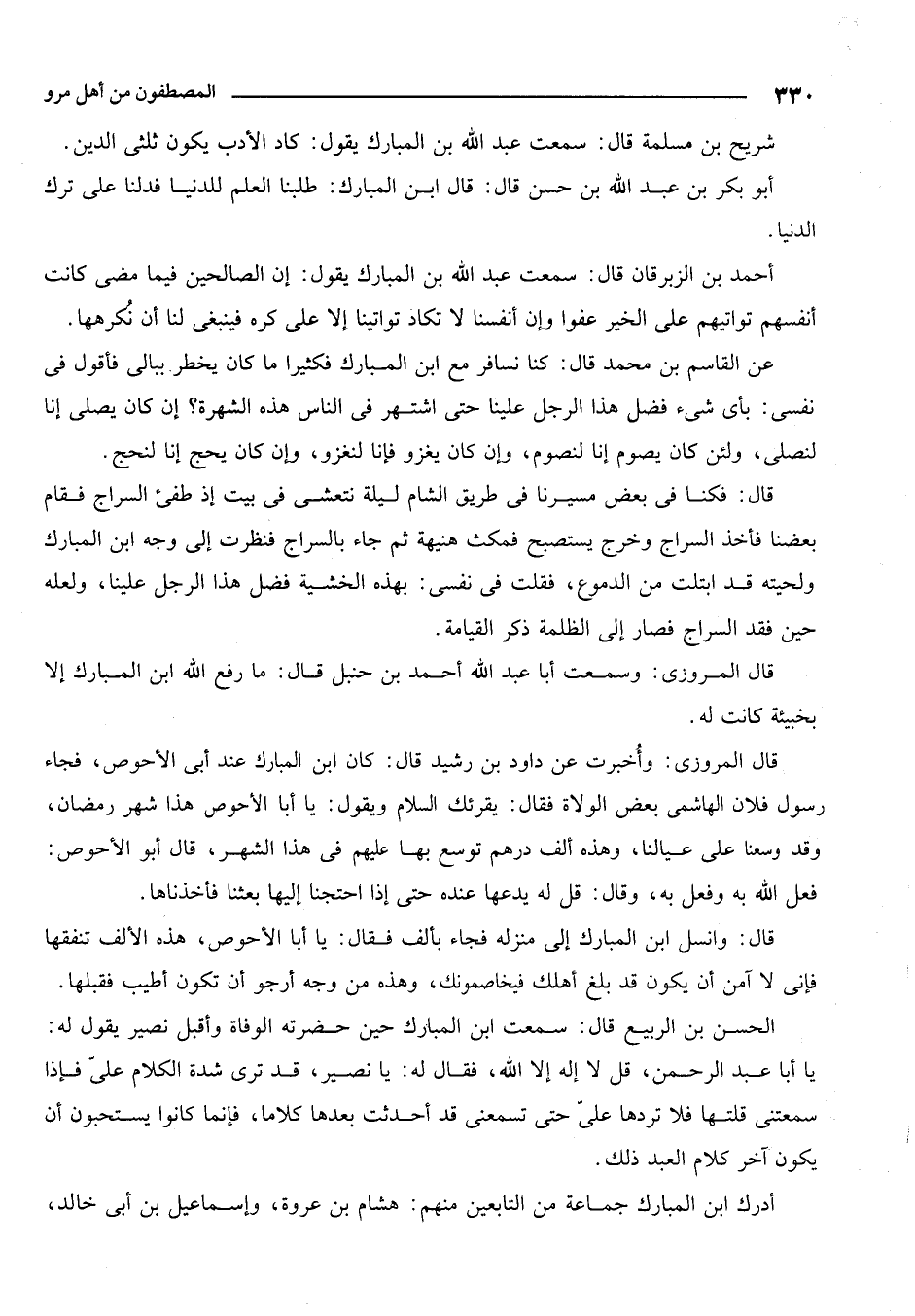 أحمد بن الزبرقان قال: سمعت عبد الله بن المبارك يقول: إن الصالحين فيما مضى كانت أنفسهم تواتيهم على الخير عفواً وإن أنفسنا لا تكاد تواتينا إلا على كره فينبغي لنا أن نكرهها.