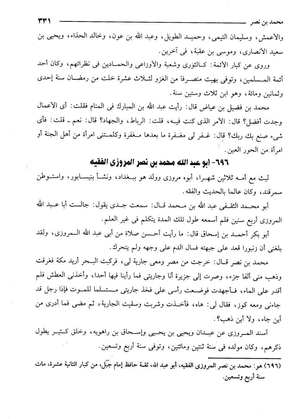 696 - هو: محمد بن نصر المروزي الفقيه، أبو عبد الله، ثقة حافظ إمام جبل، من كبار الثانية عشرة، مات سنة أربع وتسعين.