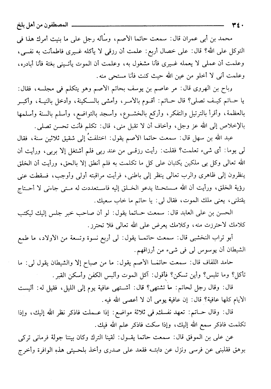 عبد الله بن سهل قال: سمعت حاتماً الأصم يقول: اختلفت إلى شقيق ثلاثين سنة، فقال لي يوماً: أي شيء تعلمت؟ فقتل: رأيت رزقي من عند ربي فلم أشتغل إلا بربي، ورأيت أن الله تعالى وكل بي ملكين يكتبان علي كل ما تكلمت به فلم أنطق إلا بالحق، ورأيت أن الخلق ينظرون إلى ظاهري والرب تعالى ينظر إلى باطني، فرأيت مراقبته أولى وأوجب، فسقطت عني رؤية الخلق، ورأيت أن الله مستحثاً يدعو الخلق إليه فاستعددت له متى جاءني لا أحتاج يقتلني، يعني ملك الموت. فقال لي: يا حاتم ما خاب سعيك.