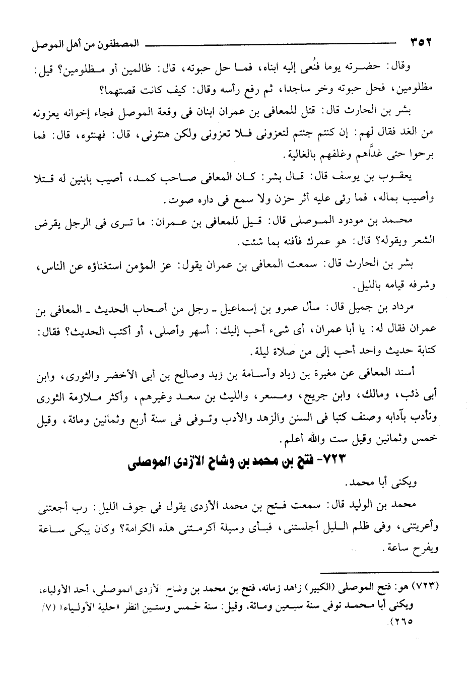 723 - هو: فتح الموصلي "الكبير" زاهد زمانه، فتح بن محمد بن وشاح الأزدي الموصلي، أحد الأولياء، ويكنى أبا محمد توفي سنة سبعين ومائة، وقيل: سنة خمس وستيني انظر حلية الأولياء 7/265.