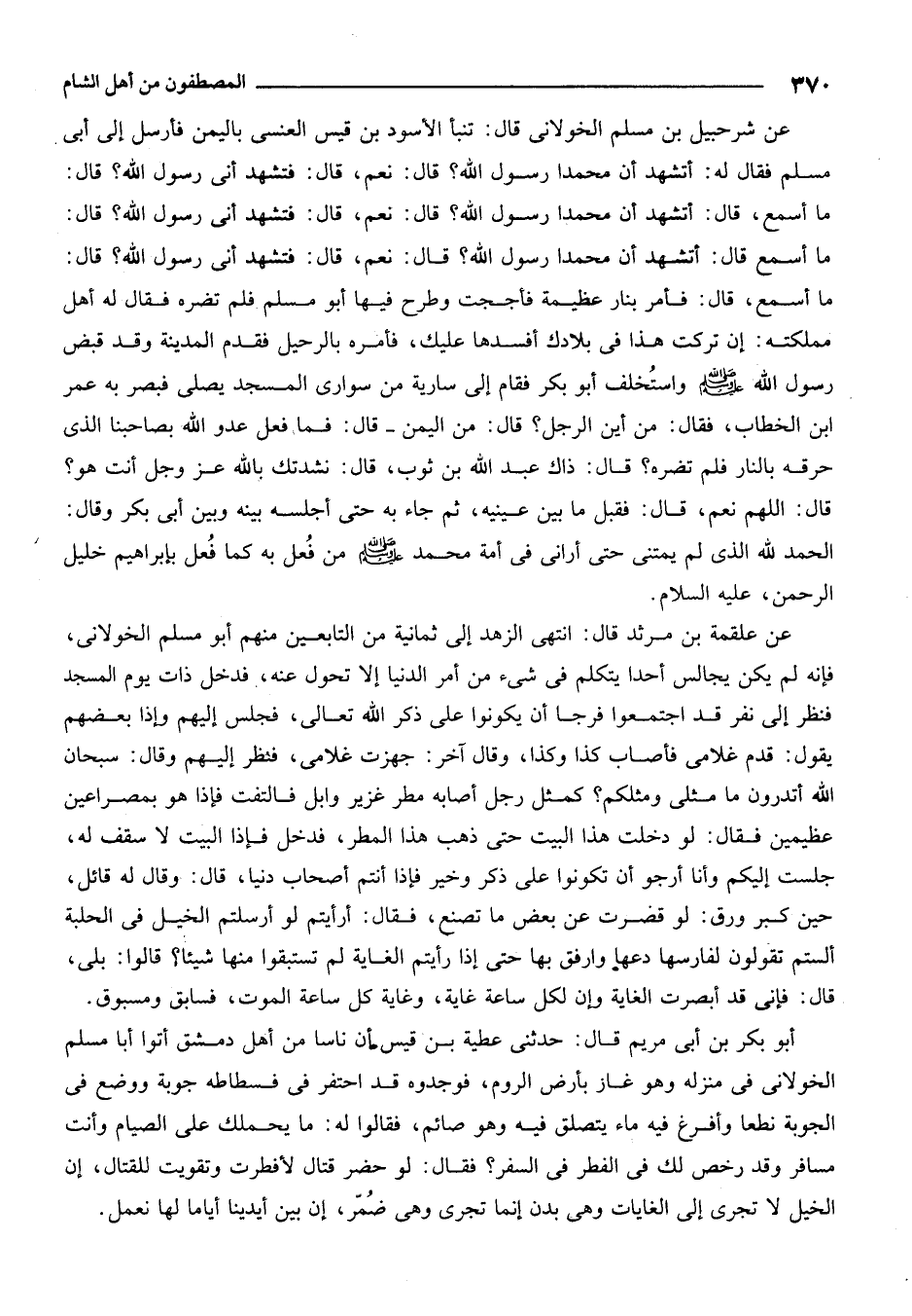عن علقمة بن مرثد قال: انتهى الزهد إلى ثمانية من التابعين منهم أبو مسلم الخولاني، فإنه لم يكن يجالس أحداً يتكلم في شيء من أمر الدنيا إلا تحول عنه، فدخل ذات يوم المسجد فنظر إلى نفر قد اجتمعوا فرجا أن يكونوا على ذكر الله تعالى، فجلس إليهم وإذا بعضهم يقول: قدم غلامي فأصاب كذا وكذا. وقال آخر: جهزت غلامي، فنظر إليهم وقال: سبحان الله أتدرون ما مثلي ومثلكم؟ كمثل رجل أصابه مطر غزير وابل فالتفت فإذا هو مبصراعين عظيمين فقال: لو دخلت هذا البيت حتى يذهب هذا المطر، فدخل فإذا البيت لا سقف له. جلست إليكم وأنا أرجو أن تكونوا على ذكر وخير فإذا أنتم أصحاب دنيا، قال: وقال له قائل، حين كبر ورق: لو قصرت عن بعض ما تصنع. فقال: أرأيتم لو أرسلتم الخيل في الحلبة ألستم تقولون لفارسها دعها وارفق بها حتى إذا رأيتم الغاية لم تستبقوا منها شيئاً؟ قالوا: بلى، قال: فإني قد أبصرت الغاية وإن لكل ساعة غاية، وغاية كل ساعة الموت، فسابق ومسبوق.