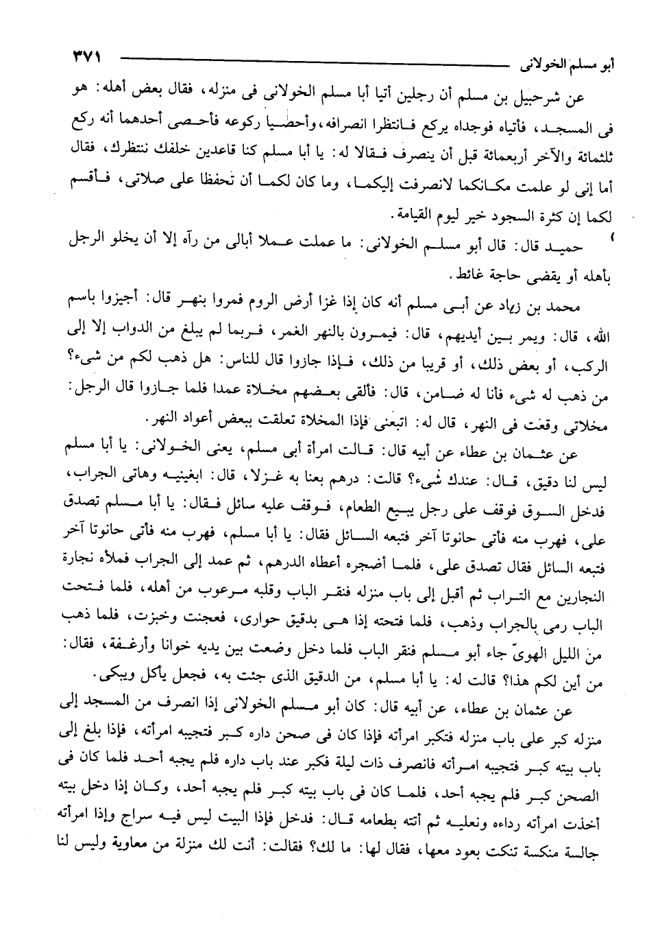 عن عثمان بن عطاء عن أبيه قال: قالت امرأة أبي مسلم يعني الخولاني: يا أبا مسلم ليس لنا دقيق. قال: عندك شيء؟ قالت: درهم بعنا به عزلاً، قال: ابغينيه وهاتي الجراب، فدخل السوق فوقف على رجل يبيع الطعام. فوقف عليه سائل فقال: يا أبا مسلم تصدق علي، فهرب منه فأتى حانوتاً آخر فتبعه السائل فقال: يا أبا مسلم، فهرب منه فأتى حانوتاً آخر فتبعه السائل فقال: تصدق علي، فلما أضجره أعطاه الدرهم، ثم عمد إلى الجراب فملأه نجارة النجارين مع التراب ثم أقبل إلى باب منزله فنقر الباب وقلبه مرعوب من أهله، فلما فتحت الباب رمى بالجراب وذهب، فلما فتحته إذا هي بدقيق حواري، فعجنت وخبزت. فلما ذهب من الليل الهوي جاء أبو مسلم لنقر الباب فلما دخل وضعت بين يديه خواناً وأرغفة. فقال: من أين لكم هذا؟ قالت له يا أبا مسلم من الدقيق الذي جئت به، فجعل يأكل ويبكي.