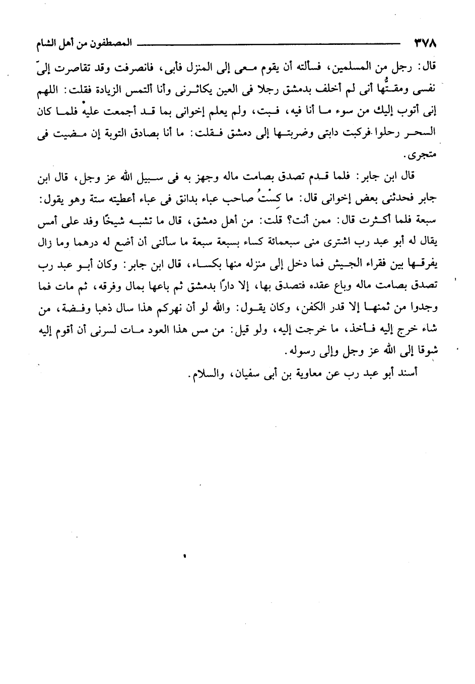 قال: رجل من المسلمين. فسألته أن يقوم معي إلى المنزل فأبى، فانصرفت وقد تقاصرت إلي نفسي ومقتها أني لم أخلف بدمشق رجلاً في العين يكاثرني وأنا ألتمس الزيادة فقلت: اللهم إني أتوب إليك من سوء ما أنا فيه، فبت ولم يعلم إخواني بما قد أجمعت عليه فلما كان السحر رحلوا فركبت دابتي وضربتها إلى دمشق فقال: ما أنا بصادق التوبة إن مضيت في متجري.