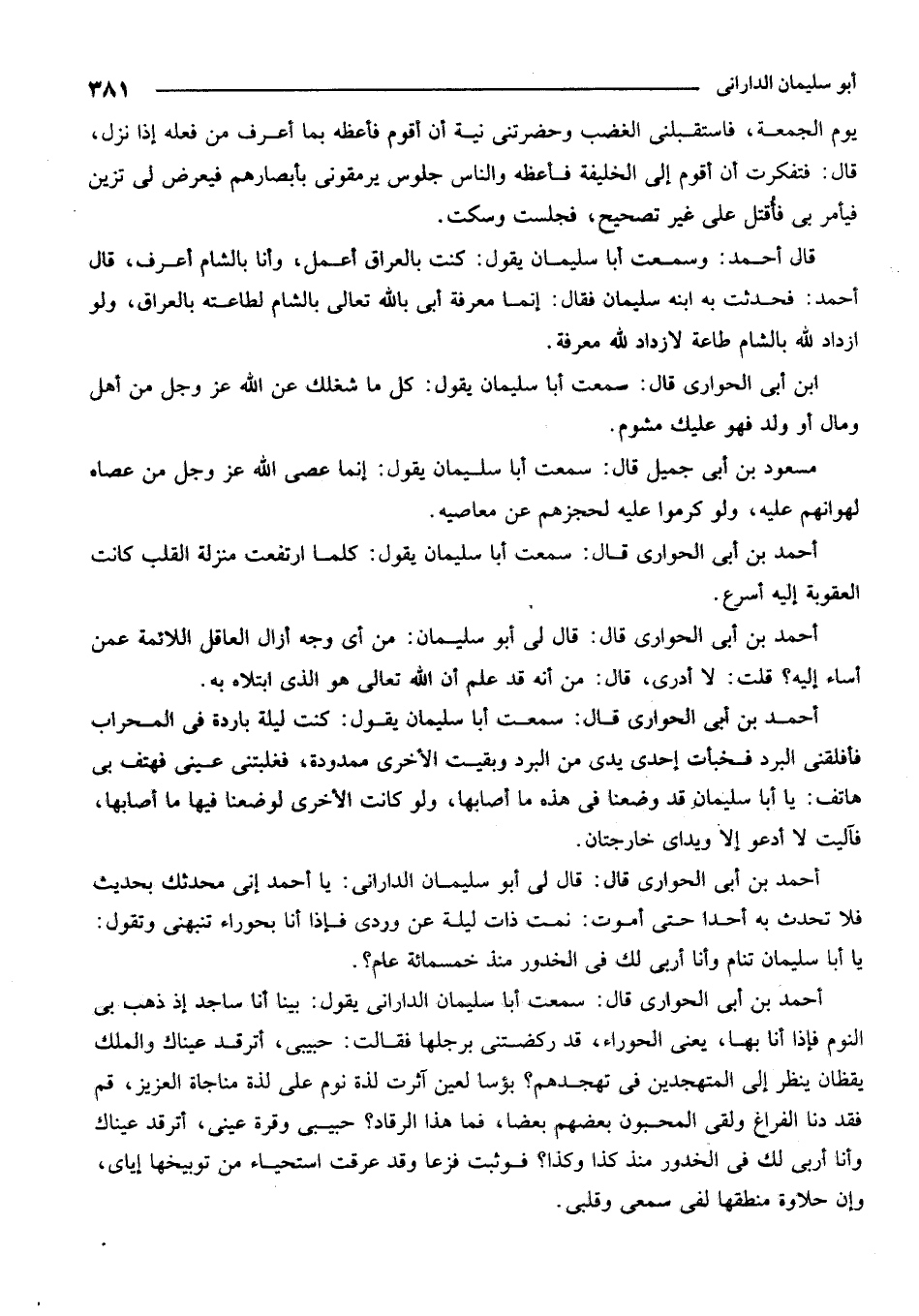 أحمد بن أبي الحواري قال: سمعت أبا سليمان الداراني يقول: بينا أنا ساجد إذ ذهب بي النوم فإذا أنا بها، يعني الحوراء، قد ركضتني برجلها فقالت: حبيبي أترقد عيناك والملك يقظان ينظر إلى المتهجدين في تهجدهم؟ بؤساً لعين آثرت لذة النوم على لذة مناجاة العزيز، قم فقد دنا الفراغ ولقي المحبون بعضهم بعضاً، فما هذا الرقاد؟ حبيبي وقرة عيني، أترقد عيناك وأنا أربي لك في الخدور منذ كذا وكذا؟ فوثبت فزعاً وقد عرقت استحياء من توبيخها إياي وإن حلاوة منطقها لفي سمعي وقلبي.