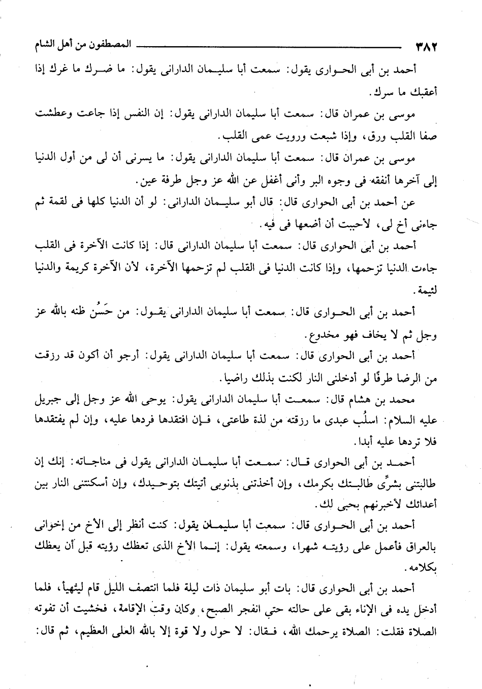 أحمد بن أبي الحواري قال: بات أبو سليمان ذات ليلة فلما انتصف الليل قام ليتهيأ، فلما أدخل يده في الإناء بقي على حالته حتى انفجر الصبح، وكان وقت الإقامة. فخشيت أن تفوته الصلاة فقلت: الصلاة يرحمك الله. فقال: لا حول ولا قوة إلا بالله العلي العظيم. ثم قال: