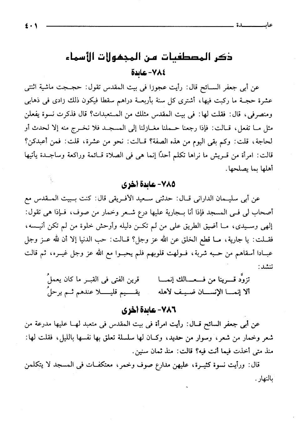 عن أبي جعفر السائح قال: رأيت عجوزاً في بيت المقدس تقول: حججت ماشية اثنتي عشرة حجة ما ركبت فيها، أشتري كل سنة بأربعة دراهم سقطاً فيكون زادي في ذهابي ومنصرفي. قال: فقلت لها: في بيت المقدس مثلك من المتعبدات؟ قال فذكرت نسوة يفعلن مثل ما تفعل. قالت: فإذا رجعنا حملنا مغازلنا إلى المسجد فلا نخرج منه إلا لحدث أو لحاجة. قلت: وكم بقي اليوم من هذه الصفة؟ قالت: نحو من عشرة. قلت: فمن أعبدكن؟ قالت: امرأة من قريش ما نراها تكلم أحد إنما هي في الصلاة قائمة وراكعة وساجدة يأتيها أهلها بما يصلحها.