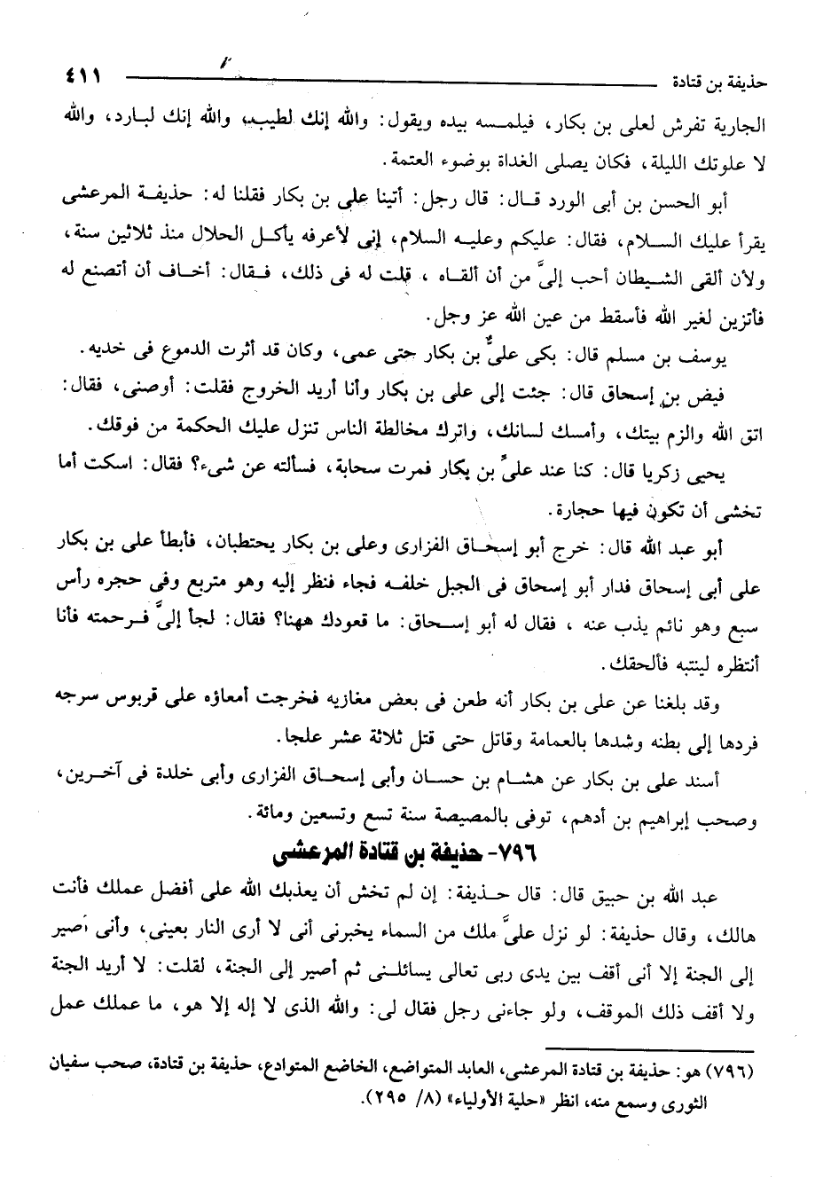 796 - هو: حذيفة بن قتادة المرعشي، العابد المتواضع، الخاضع المتوادع، حذيفة بن قتادة، صحب سفيان الثوري وسمع منه، انظر حلية الأولياء 8/295.