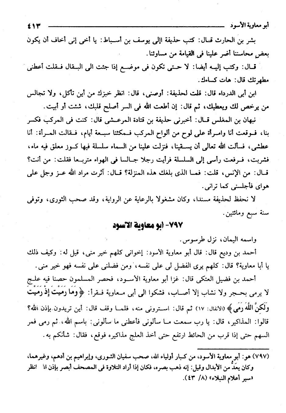 797 - هو: أبو معاوية الأسود، من كبار أولياء الله، صحب سفيان الثوري، وإبراهيم بن أدهم، وغيرهما، وكان يعد من الأبدال وقيل: إنه ذهب بصره، فكان إذا أراد التلاوة في المصحف أبصر بإذن الله، انظر سير أعلام النبلاء 8/43.