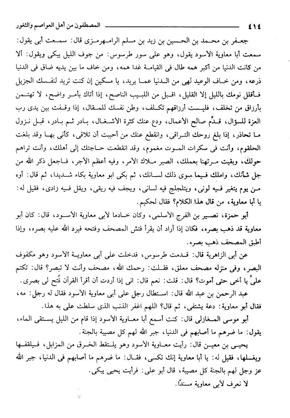 جعفر بن محمد بن الحسين بن زيد بن مسلم الرامهرمزي قال: سمعت أبي يقول: سمعت أبا معاوية الأسود يقول، وهو على سور طرسوس، من جوف الليل، يبكي ويقول: ألا من كانت الدنيا من أكبر همه طال في القيامة غداً همه. ومن خاف ما بين يديه ضاق في الدنيا ذرعه. ومن خاف الوعيد، لهي من الدنيا عما يريد، يا مسكين إن كنت تريد لنفسك الزيل، فأقلل نومك بالليل إلا القليل، أقبل من اللبيب الناصح، إذا أتاك بأمر واضح، لا تهتمن بأرزاق من تخلف، فلست أرزاقهم تكلف، وطن نفسك للمقال، إذا وقفت بين يدي رب العزة للسؤال، قدم صالح الأعمال، ودع عنك كثرة الأشغال، بادر ثم بادر، قبل نزول ما تحاذر، إذا بلغ روحك التراقي، وانقطع عنك من أحببت أن تلاقي، كأني بها وقد بلغت الحلقوم، وأنت في سكرات الموت مغموم، وقد انقطعت حاجتك إلى أهلك، وأنت تراهم حولك. وبقيت مرتهناً بعملك، الصبر ملاك الأمر، وفيه أعظم الأجر، فاجعل ذكر الله من جل شأنك، واملك فيما سوى ذلك لسانك. ثم بكى أبو معاوية بكاء شديداً. ثم قال: أوه من يوم يتغير فيه لوني، ويتلجلج فيه لساني، ويجف فيه ريقي، ويقل فيه زادي. فقيل له: يا أبا معاوية من قال هذا الكلام؟ فقال لحكيم.