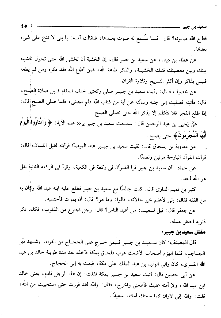 عن أبي حصين قال: أتيت سعيد بن جبير بمكة فقلت: إن هذا الرجل قادم، يعني خالد بن عبد الله، ولا آمنه عليك، فأطعني واخرج فقال: والله لقد قررت حتى استحييت من الله، قلت: والله إني لأراك، كما سمتك أمك، سعيداً.