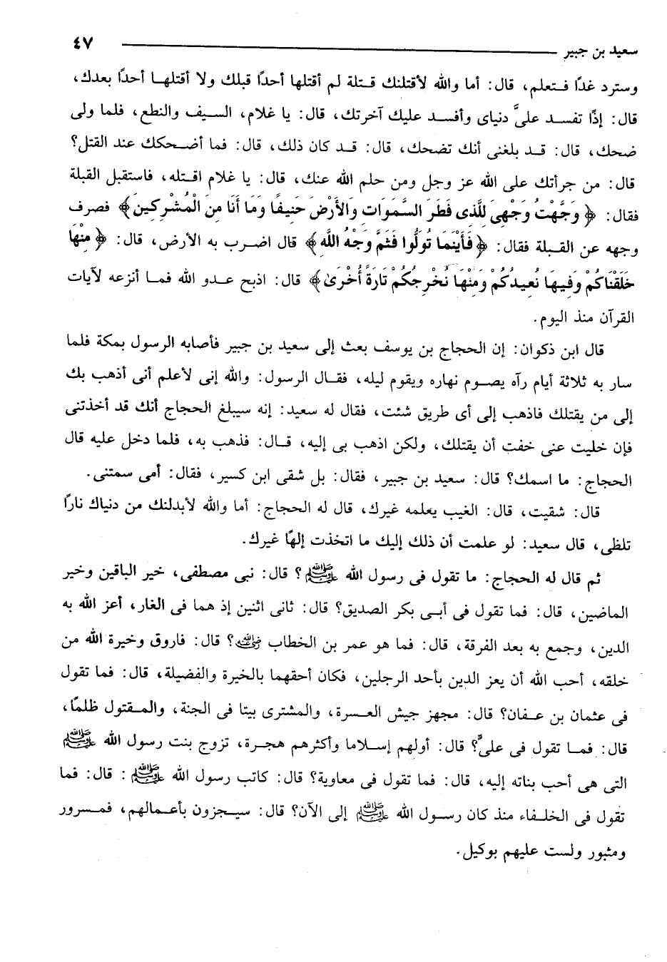 قال: شقيت. قال: الغيب يعلمه غيرك. قال له الحجاج: أما والله لأبدلنك من دنياك ناراً تلظى. قال سعيد: لو علمت أن ذلك إليك ما اتخذت إلهاً غيرك.