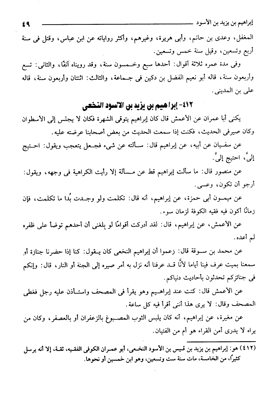 412 - هو: إبراهيم بن يزيد بن قيس بن الأسود النخعي، أبو عمران الكوفي الفقيه، ثقة، إلا أنه يرسل كثيرا، من الخامسة، مات سنة ست وتسعين، وهو ابن خمسين أو نحوها.