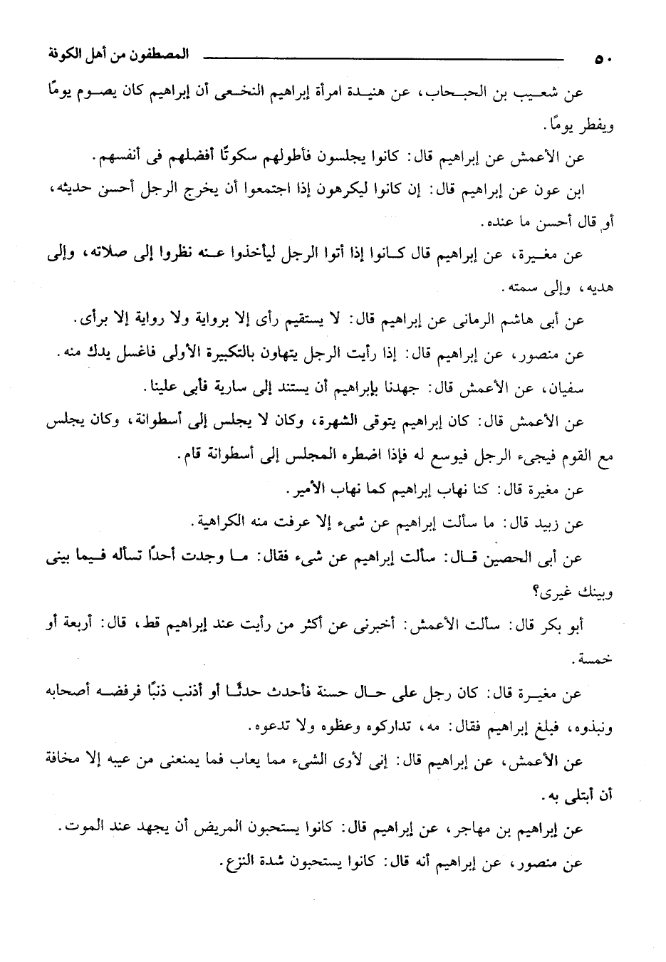عن زبيد قال: ما سألت إبراهيم عن شيء إلا عرفت منه الكراهية.