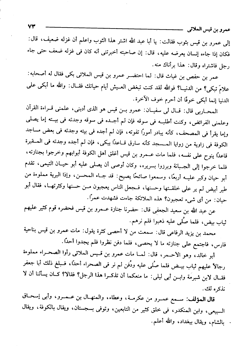 أبو خالد، وهو الأحمر، قال: لما مات عمرو بن قيس الملائي رأوا الصحراء مملوءة رجالاً عليهم ثياب بيض فلما صلي عليه ودفن لم نر في الصحراء أحداً. فبلغ ذلك أبا جعفر فقال لابن شبرمة وابن أبي ليلى: ما منعكما أن تذكرا هذا الرجل؟ فقالا: كان يسألنا أن لا نذكره لك.