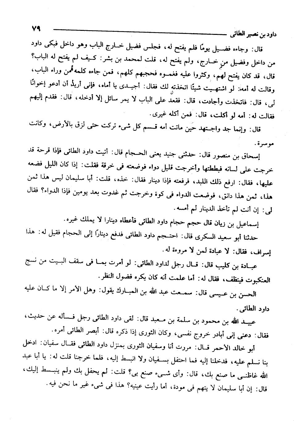 عبيد الله بن محمود بن سلمة بن معبد قال: لقي داود الطائي رجلاً فسأله عن حديث، فقال: دعني إني أبادر خروج نفسي، وكان الثوري إذا ذكره قال: أبصر الطائي أمره.