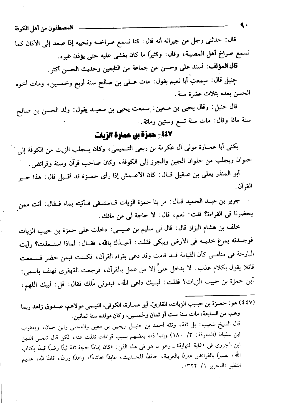 447 - هو: حمزة بن حبيب الزيات، القارئ، أبو عمارة، الكوفي، التيمي مولاهم، صدوق زاهد ربما وهم، من السابعة، مات سنة ست أو ثمان وخمسين، وكان مولده سنة ثمانين.