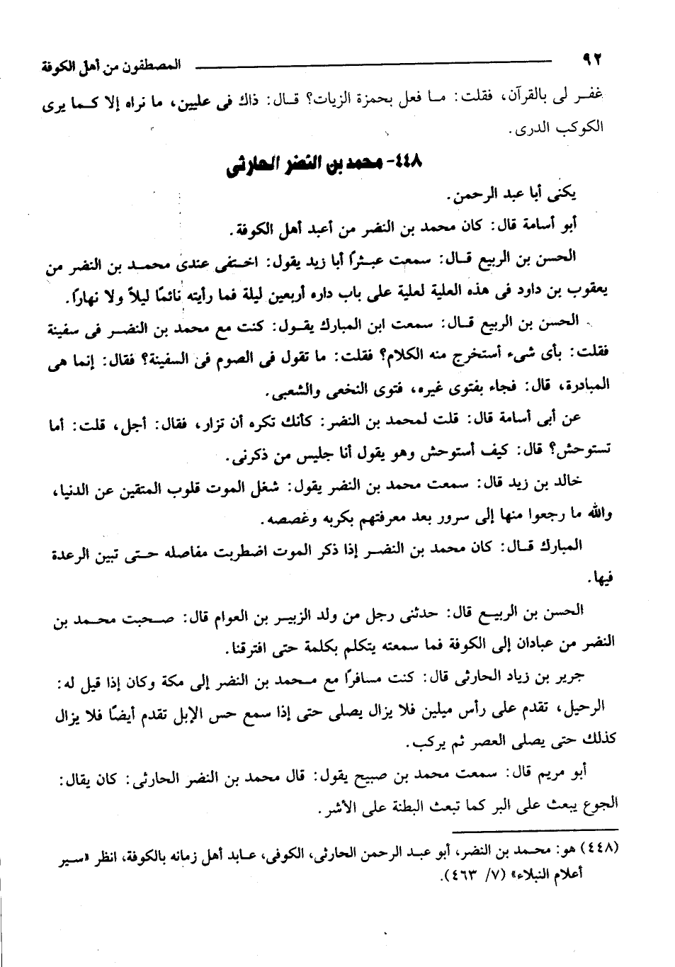 448 - هو: محمد بن النضر، أبو عبد الرحمن الحارثي، الكوفي، عابد أهل زمانه بالكوفة، انظر سير أعلام النبلاء 7/463.