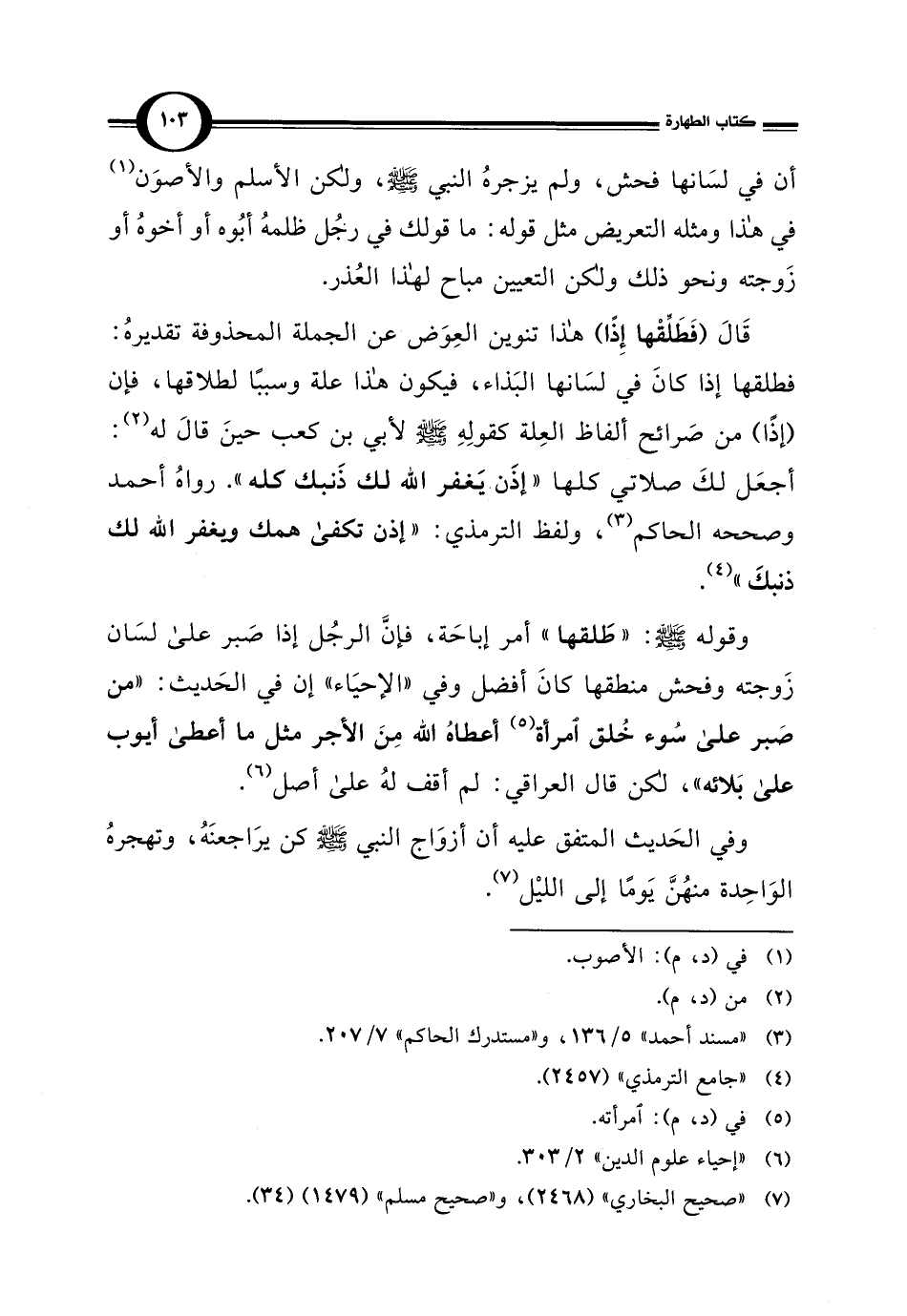 قَالَ (فَطَلِّقْها إِذًا) هذا تنوين العِوَض عن الجملة المحذوفة تقديرهُ: فطلقها إذا كانَ في لسَانها البَذاء، فيكون هذا علة وسببًا لطلاقها، فإن (إذًا) من صَرائح ألفاظ العِلة كقولِهِ - صلى الله عليه وسلم - لأبي بن كعب حينَ قالَ له (¬2) أجعَل لكَ صلاتي كلها "إذَن يَغفر الله لك ذَنبك كله". رواهُ أحمد وصححه الحاكم (¬3)، ولفظ الترمذي: "إذن تكفى همك ويغفر الله لك ذنبكَ" (¬4).