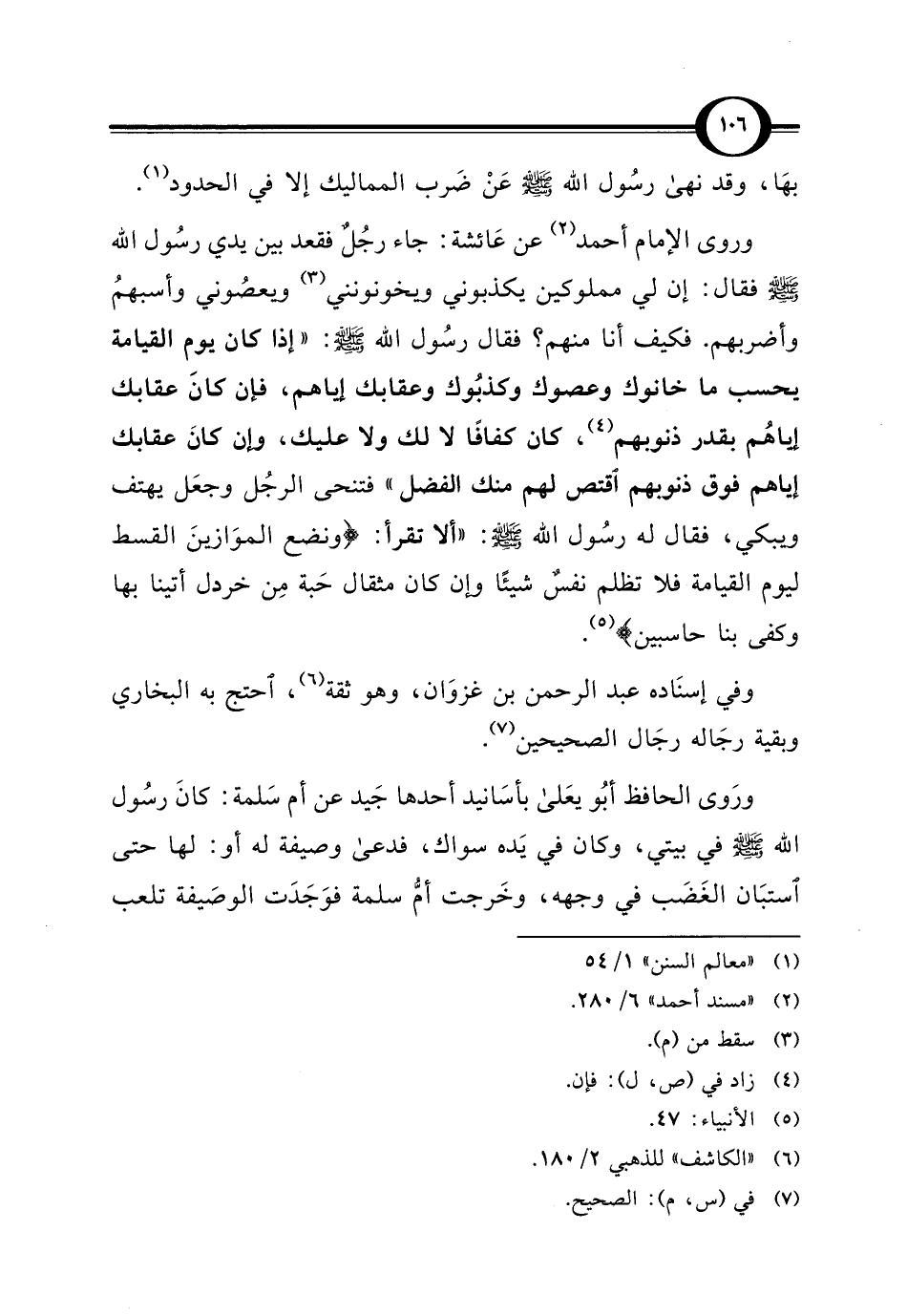 ورَوى الحافظ أبُو يعَلى بأسَانيد أحدها جَيد عن أم سَلمة: كانَ رسُول الله - صلى الله عليه وسلم - في بيتي، وكان في يَده سواك، فدعى وصيفة له أو: لها حتى استبَان الغَضب في وجهه، وخَرجت أمُّ سلمة فوَجَدَت الوصَيفة تلعب