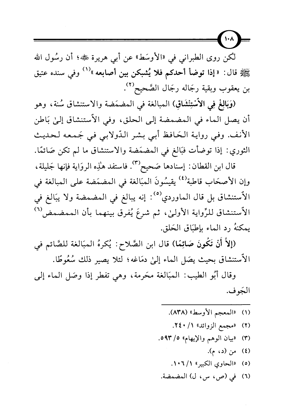(وَبَالِغْ فِي الاسْتِنْشَاقِ) المبالغة في المضمَضة والاستنشاق سُنة، وهو أن يصل الماء في المضمضة إلى الحلق، وفي الاستنشاق إلى بَاطن الأنف. وفي رواية الحَافظ أبي بشر الدّولابي في جَمعه لحديث الثوري: إذا توضأت فبَالغ في المضمَضة والاستنشاق ما لم تكن صَائمًا.
