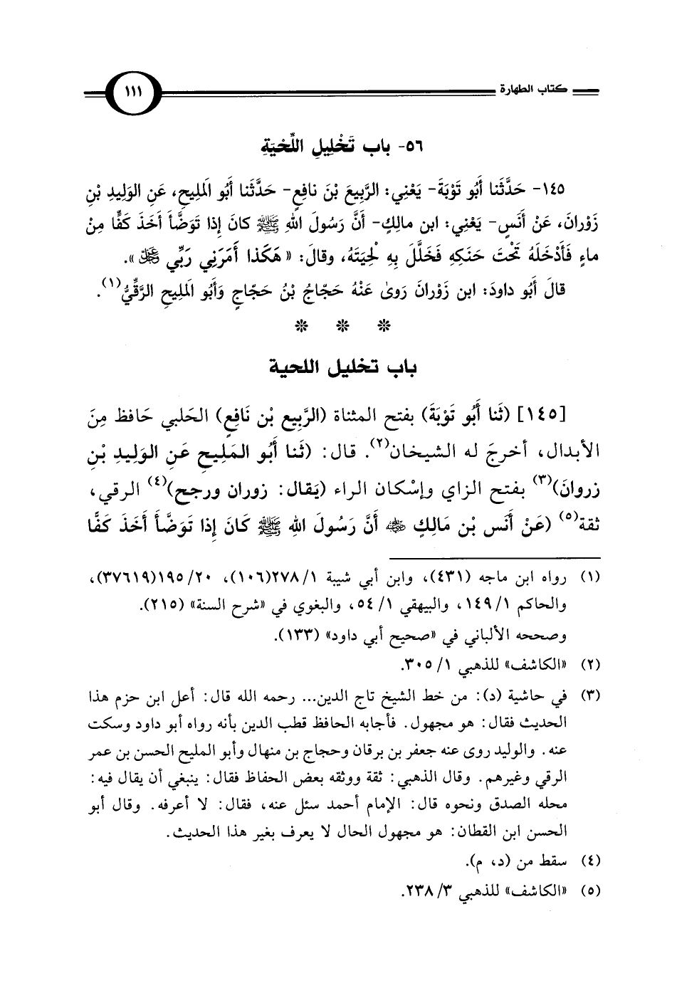 145 - حَدَّثَنا أَبُو تَوْبَةَ - يَعْنِي: الرَّبِيعَ بْنَ نافِعٍ - حَدَّثَنا أَبُو المَلِيحِ، عَنِ الوَلِيدِ بْنِ زَوْرانَ، عَنْ أَنَسٍ - يَعْنِي: ابن مالِكٍ - أَنَّ رَسُولَ اللهِ - صلى الله عليه وسلم - كانَ إِذا تَوَضَّأَ أَخَذَ كَفًّا مِنْ ماءٍ فَأَدْخَلَهُ تَحْتَ حَنَكِهِ فَخَلَّلَ بِهِ لْحِيَتَهُ، وقالَ: "هَكَذا أَمَرَنِي رَبِّي عزَّ وجلَّ".