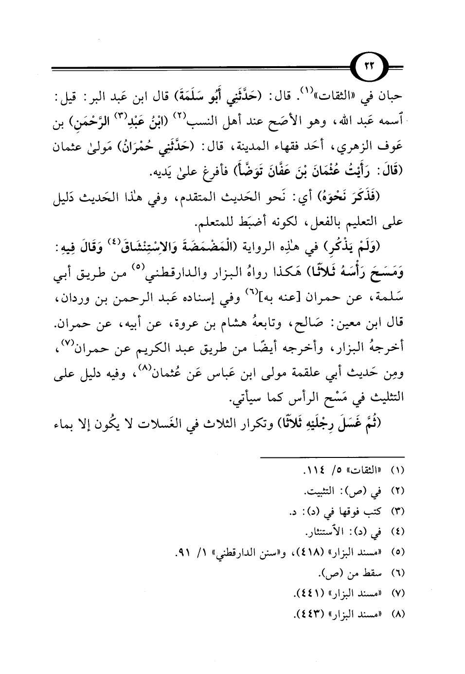 حبان في "الثقات" (¬1). قال: (حَدَّثَنِي أَبُو سَلَمَةَ) قال ابن عَبد البر: قيل: اسمه عَبد الله، وهو الأصَح عند أهل النسب (¬2) (ابْنُ عَبْدِ (¬3) الرَّحْمَنِ) بن عَوف الزهري، أحَد فقهاء المدينة، قال: (حَدَّثَنِي حُمْرَانُ) مَولى عثمان (قَالَ: رَأَيْتُ عُثْمَانَ بْنَ عَفَّانَ تَوَضَّأَ) فأفرغ على يَديه.